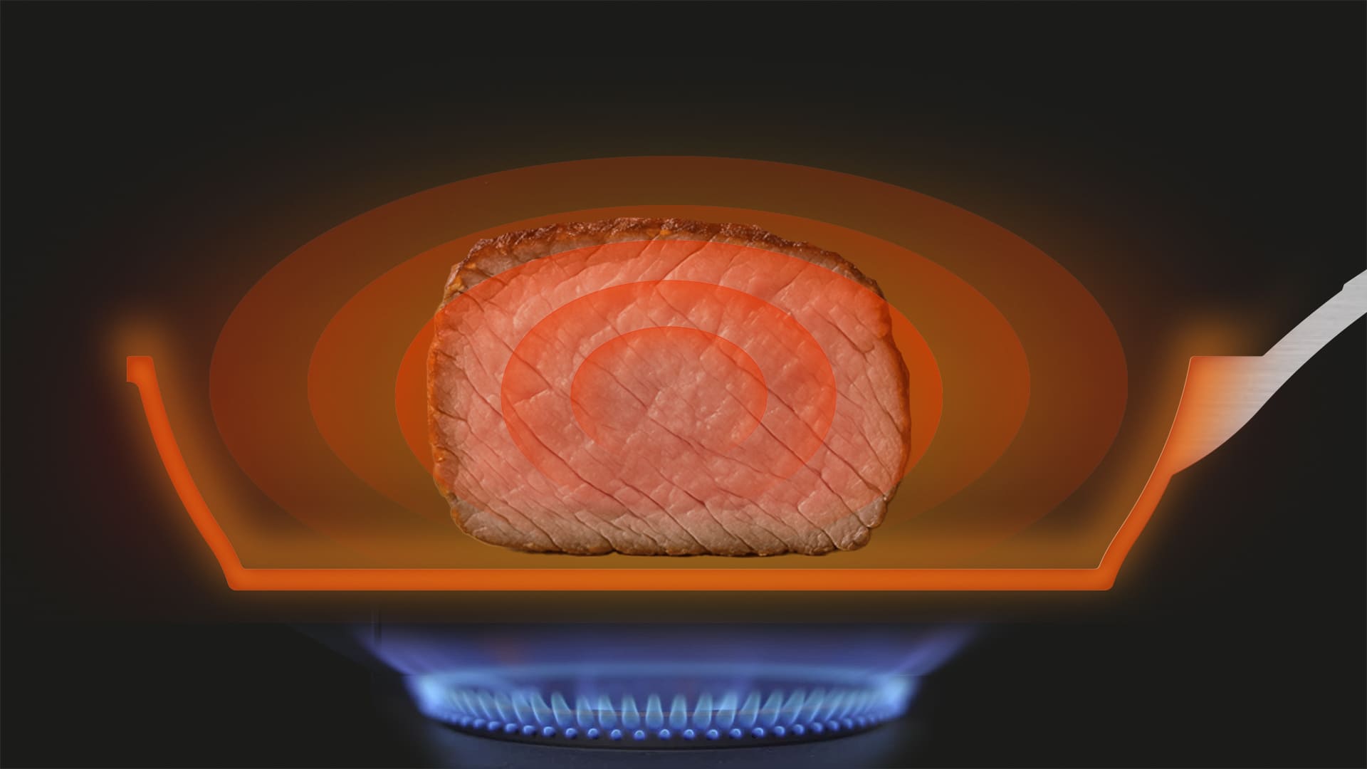 鋳鉄の「蓄えられた熱」と「輻射熱」は、コーティング層に遮断されることなく、食材に均等に伝わります。この特性により、鉄器は「勝手に美味しくしてくれる」とプロの料理人に評価されるほどの料理力を発揮。蓄えられた熱は鉄器の表面温度を安定させ、食材を均一に調理。さらに、通常の鋳鉄の約2.5倍の「輻射熱」が空間を伝い、食材の内側までじっくりアプローチして旨味を引き出します。この2つの熱が、食材の風味と美味しさを閉じ込めます。