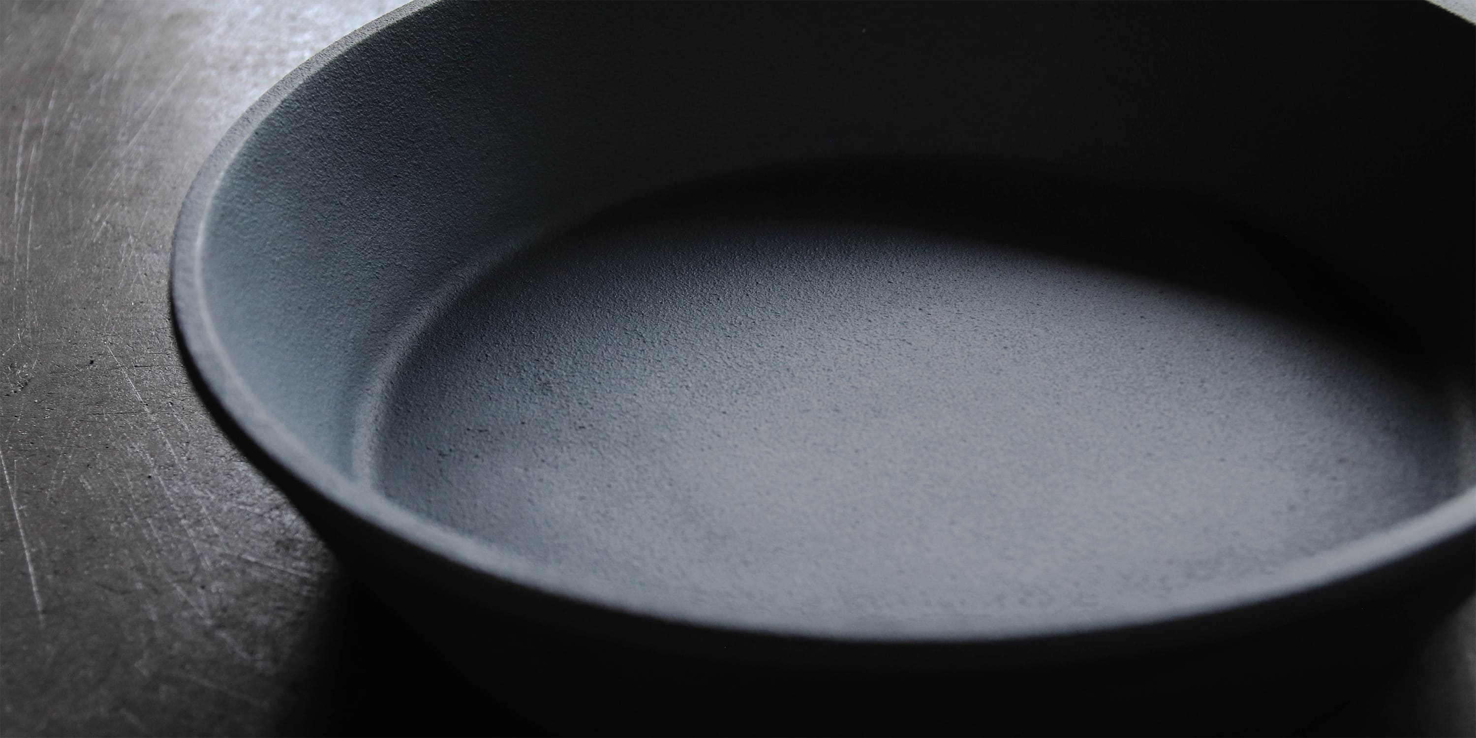 「無塗装はだか仕上げ」の鉄鍋や鉄フライパンは、やさしいグレー色をしています。型から取り出したばかりのねずみ色の鉄器は湿気ですぐに錆びてしまうため、南部鉄器では塗装を施すのが常識でした。しかし及源鋳造は、900℃の高温で焼き上げることで鉄そのものの組成を変化させ、錆びにくくする製法に挑み、革新的技法開発に成功しました。鉄の表情をそのままに、安全でタフな一枚に仕上げています。