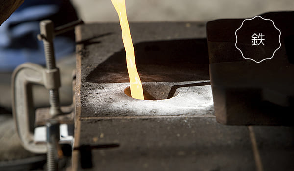 鉄鋳物は、鮮やかなだいだい色に溶けた鉄を、砂で作った型に流し込み、温度が下がり固まったら、砂型を崩してできあがるもの。