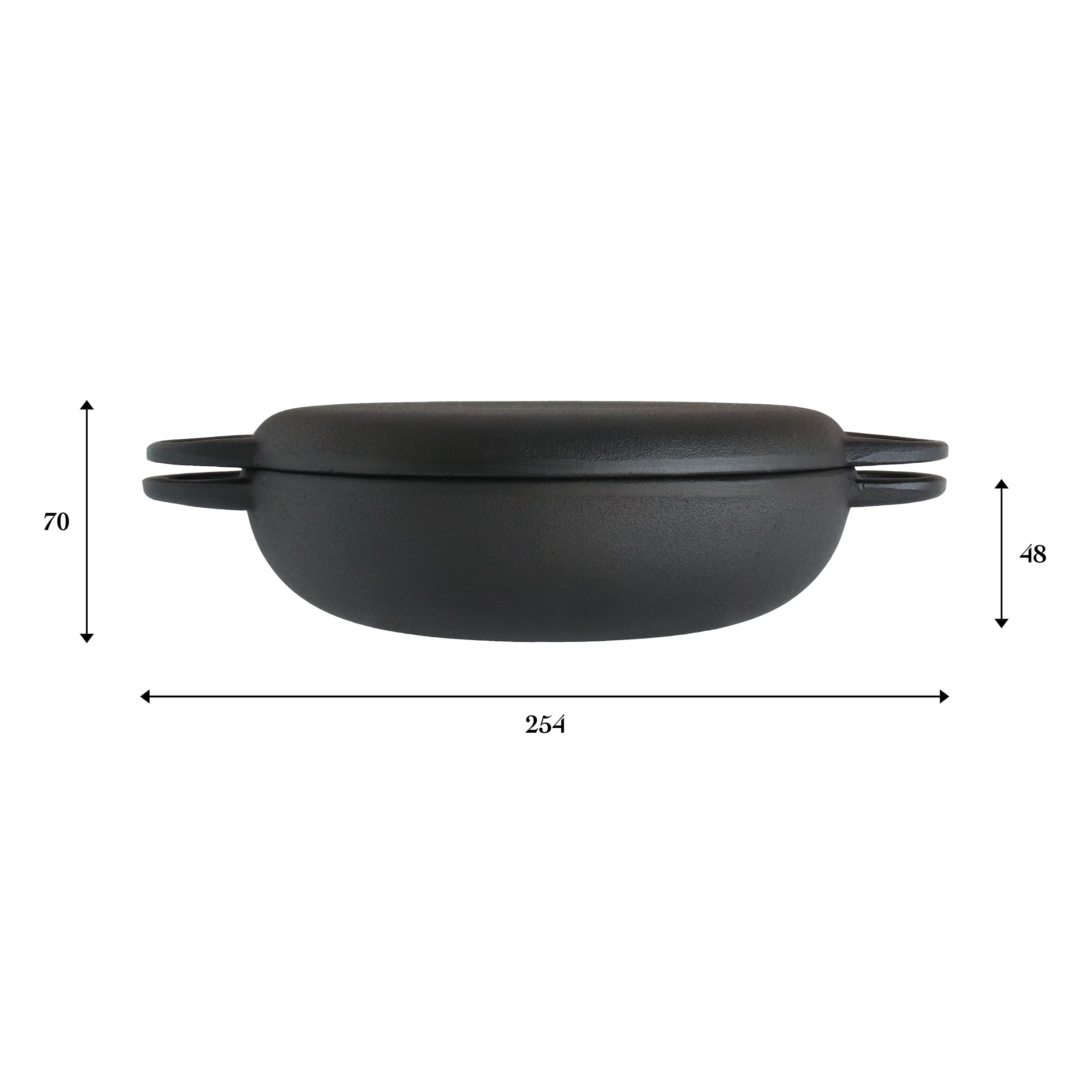 丸いフォルムと丸い耳が特徴的なクラフト・デザイン。浅めの鉄鍋で、18cmは1~2人分のおかずが作れる小回りが利くサイズ感。鋳鉄製の本体と蓋はどちらも調理に使え、「炒め」「焼き」「蒸し」「炊き」のすべてを万能にこなします。食卓にそのまま運べばうつわにも。ジャンルを問わず、どんな料理やしつらえにも馴染む素朴さが愛される理由。コンロを出して囲むお鍋料理にも最適。ニューラウンド万能鍋 18㎝は、「料理を温かいままテーブルに」という職人の閃きから生まれ、のちに1976年グッドデザイン賞、1992年ロングライフデザイン賞を受賞しました。