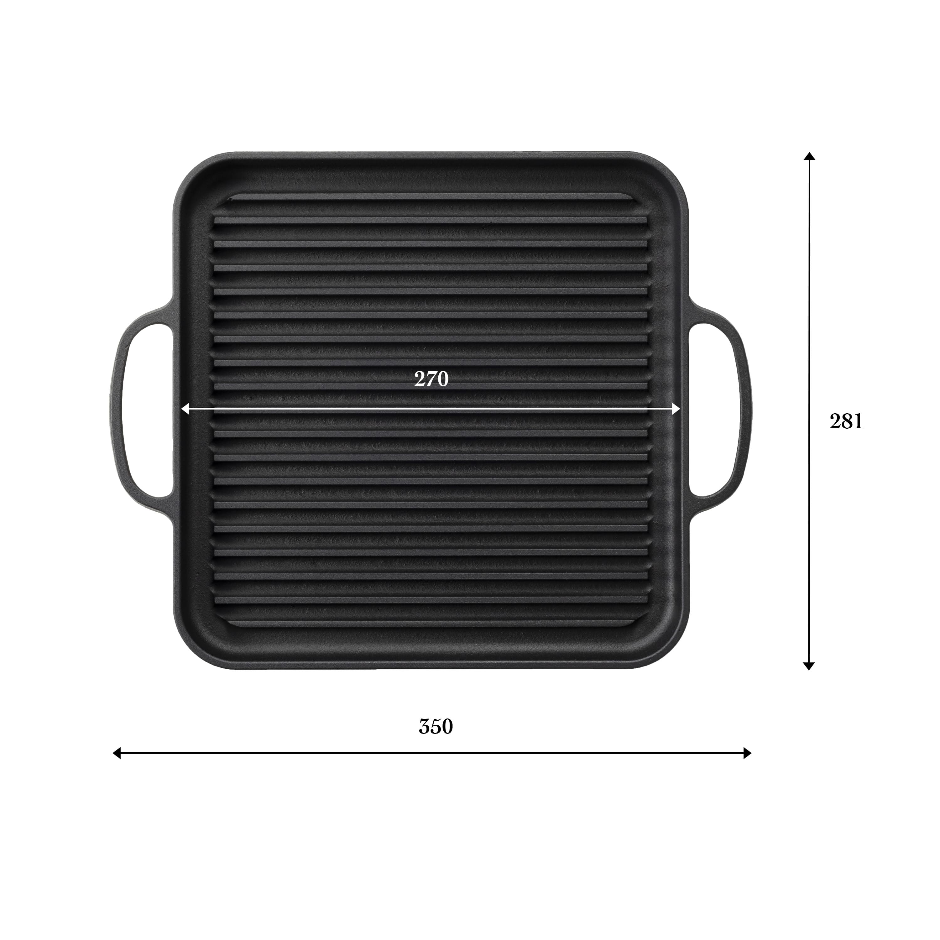 プロの料理人にも選ばれる約8mmの深い溝が際立つ鋳鉄製グリルパン。内径約27cm×27cmと大きなサイズで、複数の食材を一気に調理できます。特に油分の多い肉の調理に最適。溝からの「間接的な熱」と食材に触れる「直接的な熱」のダブル効果で調理します。鋳鉄製グリルパンでないと出せない、美しく香ばしい焼き目と香りをまとったジューシーな仕上がり。深い溝はささらなどの細長い道具でのお手入れがおすすめです。