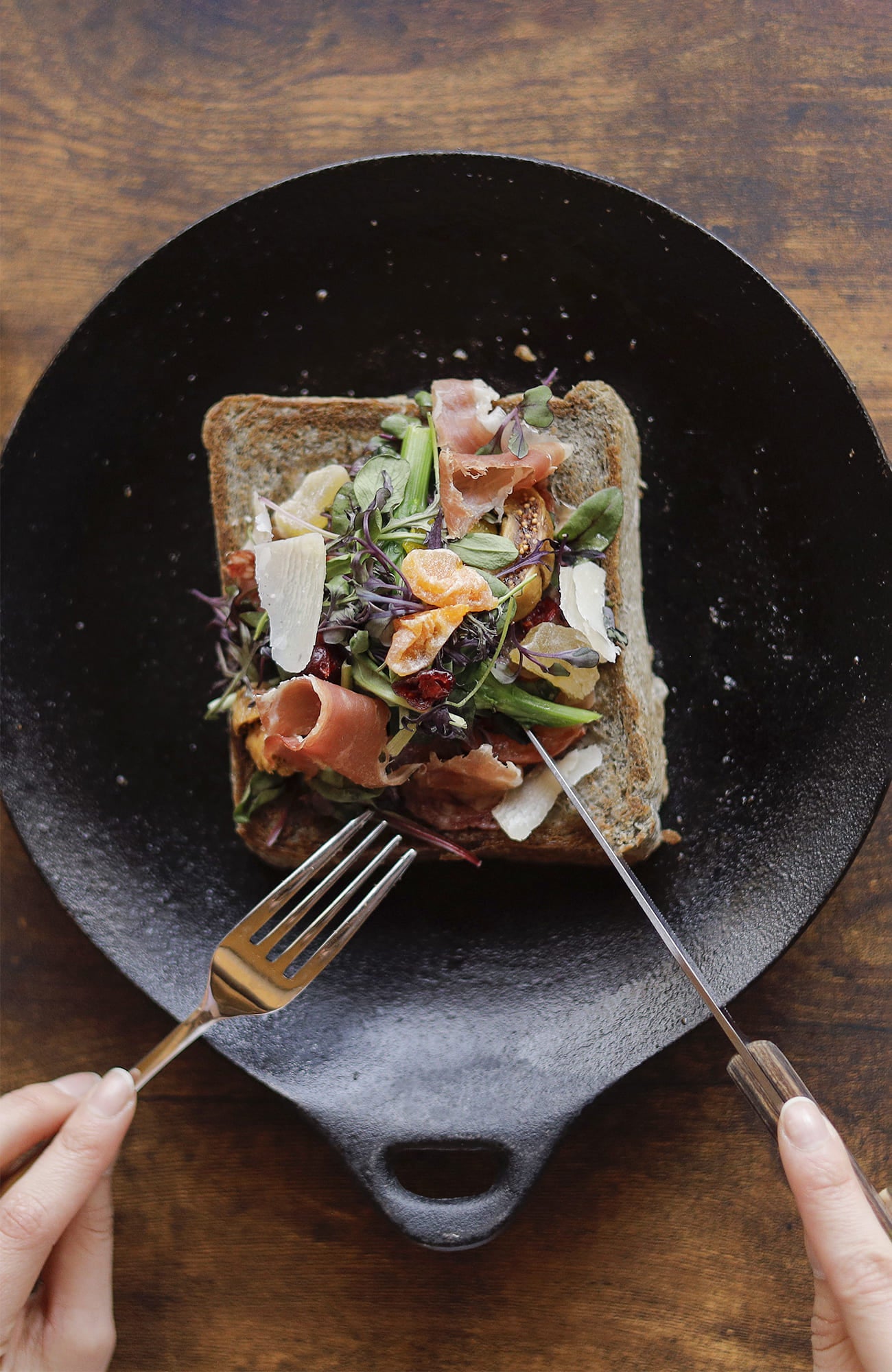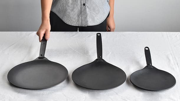 着脱式のハンドルが付いたユニークな平皿プレート型の鉄鋳物フライパンです。シンプルなカタチと優れた実用性で、バリエーション豊かな使用シーンが自慢です。ガスコンロから、薪火や炭火などの直火、オーブンまで使え、調理した後はそのままうつわに変身します。ピアット 20㎝はトースターにも入る小ぶりで一人分にちょうどいいサイズ感です。シンプルなカタチとは裏腹に、焼き野菜、ピザ、目玉焼き、焼き魚、クレープなどのデザートまで幅広く活躍。着脱式ハンドルは持ち運びの際に使います。