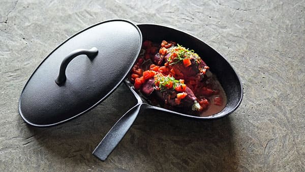 工芸家・故小笠原陸兆氏がデザインした鉄蓋付き楕円形鉄鍋フライパン。南部鉄器の産地、岩手県奥州市出身の陸兆氏の代表作です。名前に「魚」を冠し、堂々とした佇まい。重い鉄蓋を使って、魚の煮つけやアクアパッツァなどの魚調理に最適です。持ち手には指でつまんだような特徴的なくびれがあり、陸兆の鉄鍋フライパンに共通するデザイン。テーブルウェアとしても人気のある逸品です。