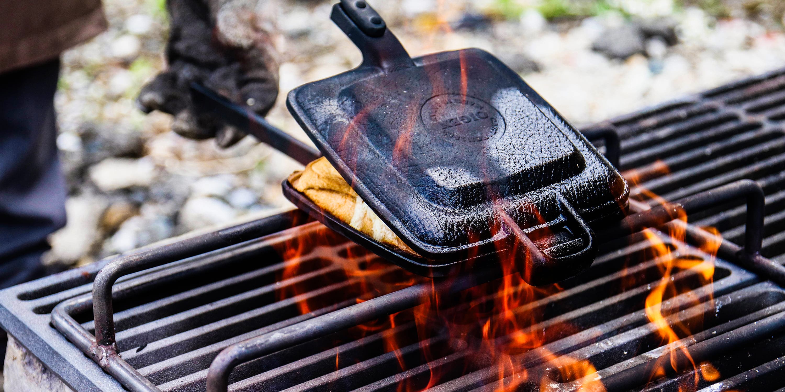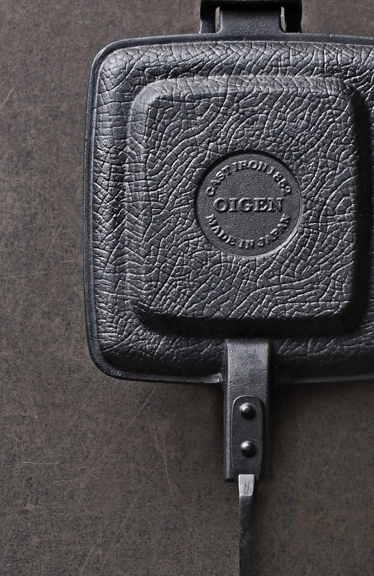 「使って欲しい」より「使い込んで欲しい」。使えば使うほど味わい深く育っていく唯一無二の鉄鋳物『ホットサンドクッカー』。無骨で野性味溢れる風貌の中に、厳しくも豊かな自然のなかで育まれた岩手のものづくりの繊細さを感じるデザイン。まるでレザーのような鋳肌が特徴です。大地の中に眠るプリミティブな「鉄」という素材で造型したこだわりの鉄のアウトドアギアです。