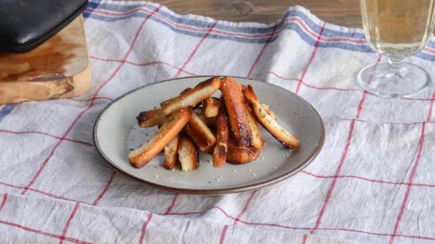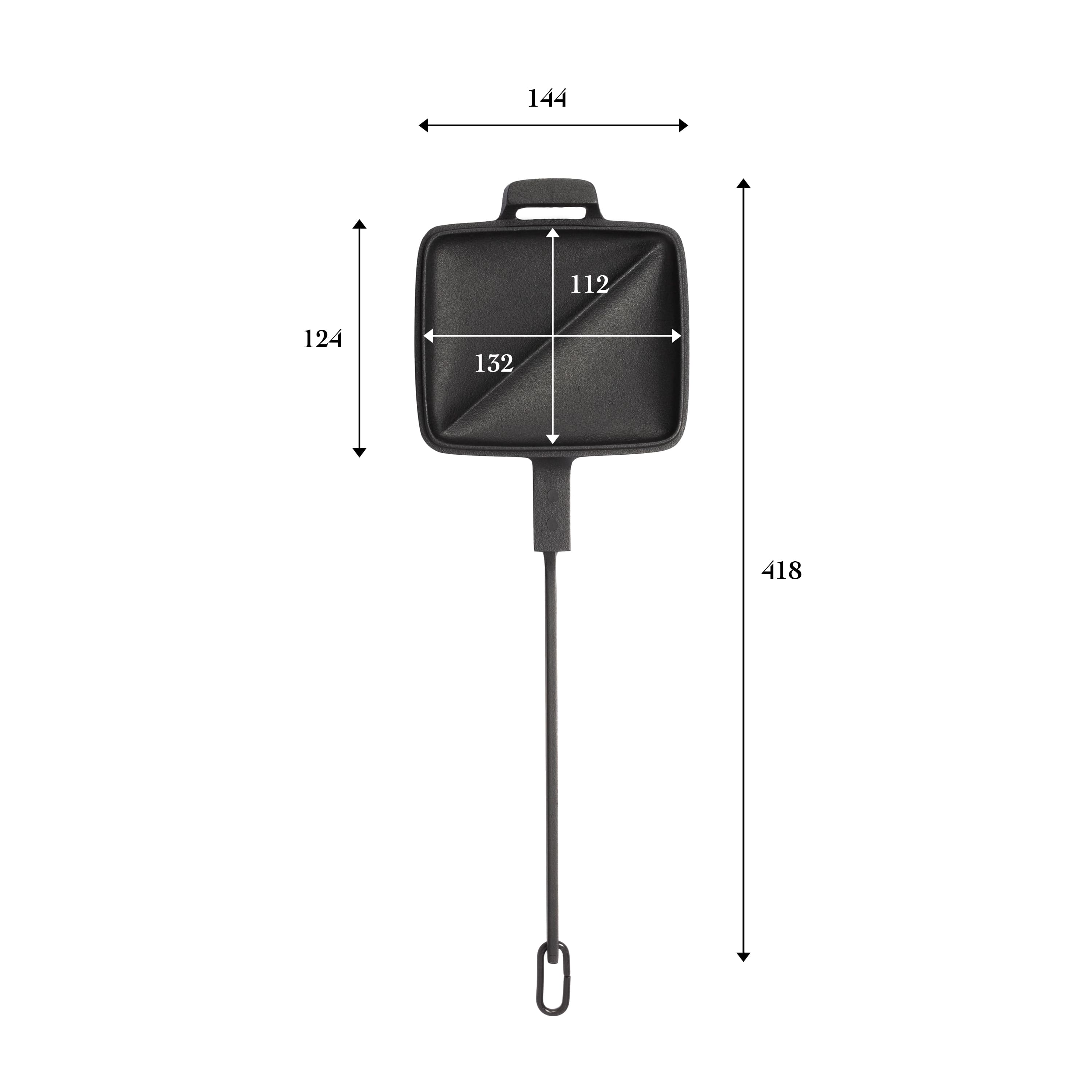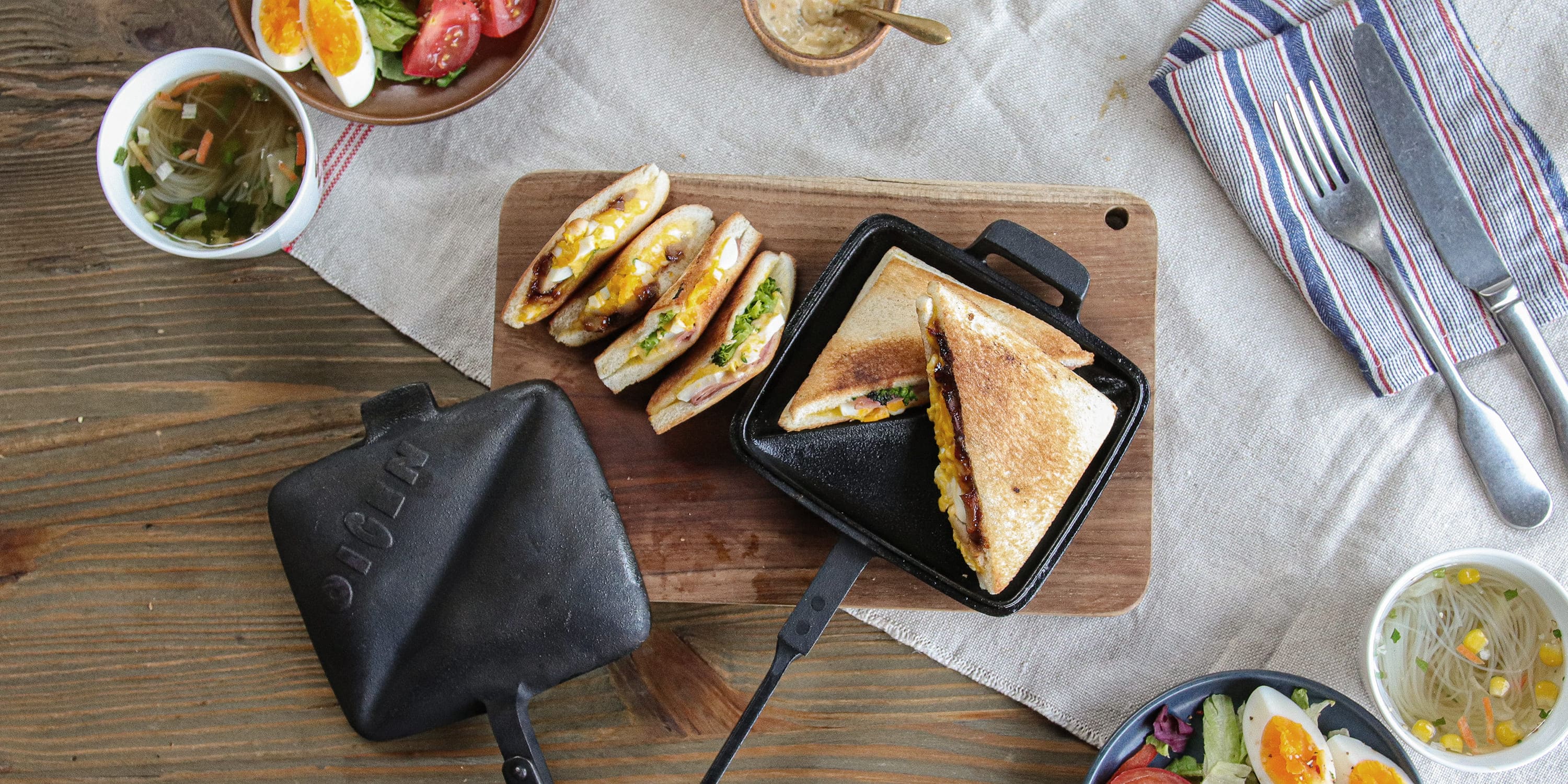 南部鉄器をアウトドアへ。クラシックロゴ「OIGEN」が鋳込まれたアウトドアシリーズ『天火』の第一号として誕生したホットサンドメーカー。鋳鉄素材が誇る蓄熱力で、表面がカリっと香ばしいホットサンドがつくれます。中央部分には仕切りがあり、ななめに切れ込みが入るのでカット&シェアがしやすいデザインです。野外はもちろんおうち使いにもおすすめです。休日の朝食や子どものおやつにもぴったり。遡ること20年以上前、アウトドア料理研究家のアドバイスを受けて開発に取り組んだアイテムです。