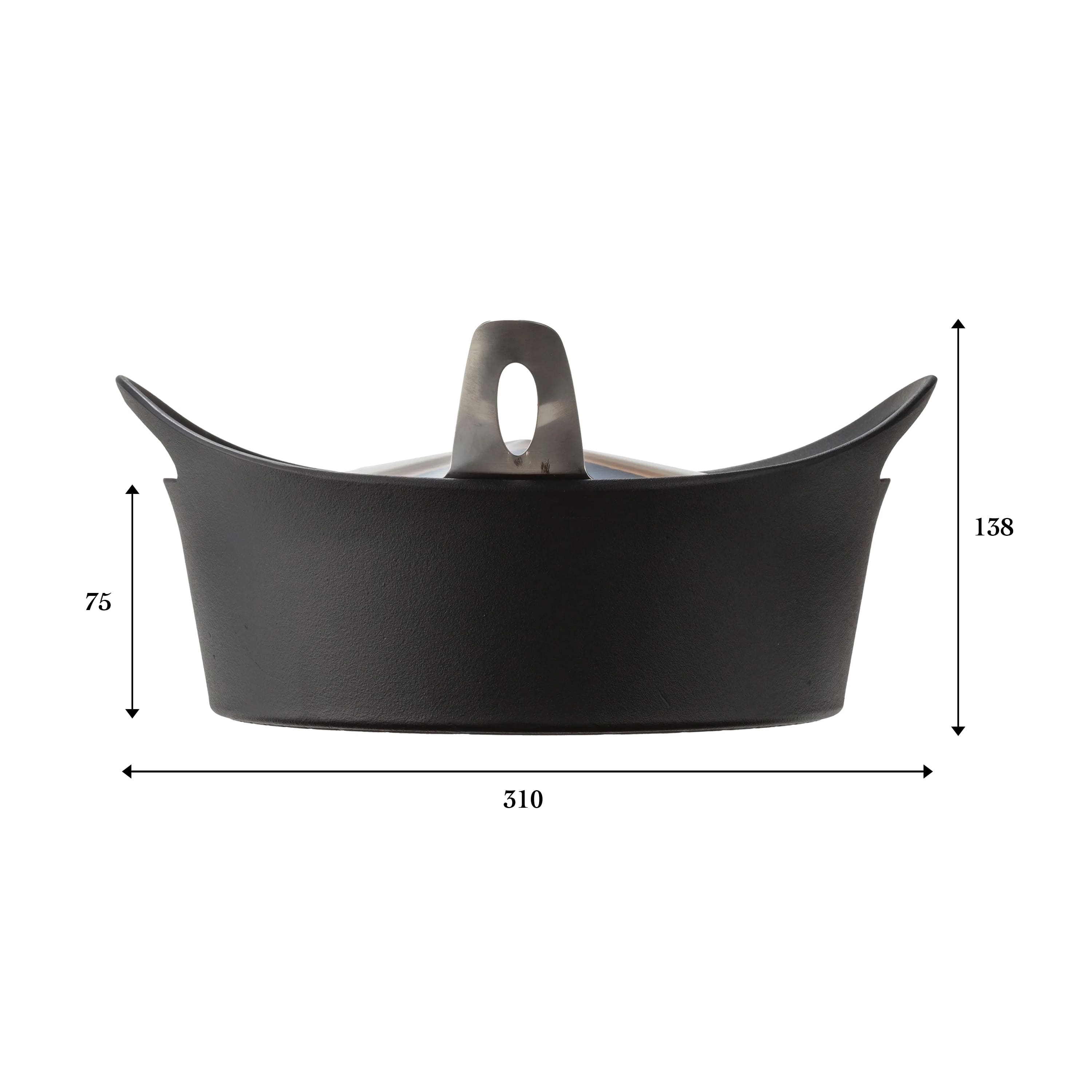 ステンレス製の蓋と鉄鋳物の本体。異素材のコントラストが印象的な鉄鍋キャセロール。4~5人分の調理に向いたサイズです。潔い直線と一筆描きのような曲線が織りなすカタチには、近代的なスタイリッシュさと日本の伝統美が感じられます。取っ手が鍋の側面から立ち上がる無駄のない設計も特徴的。プロダクトデザイナー・山田耕民氏渾身のデザインが、OIGENの技と融合し生まれた美しい鉄のプロダクトです。