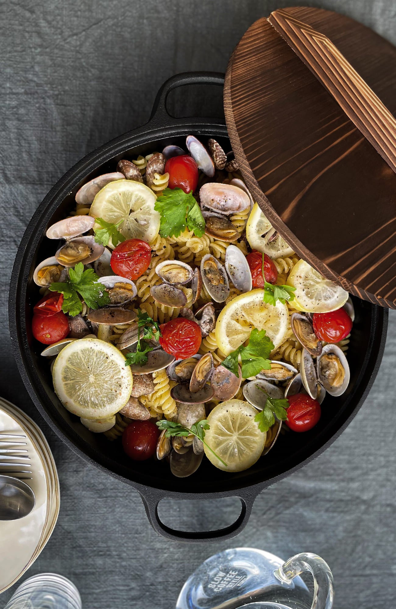 昔ながらの古風な木蓋付きの鉄鍋です。温かみを感じる焼杉の木蓋は、対流熱を閉じ込め食材にじっくり熱を伝えるだけでなく、余分な水分を吸収してくれます。適度に蒸気が逃げるので、餃子もふっくら香ばしく仕上がります。どこか懐かしい伝統的なデザインですが、直火はもちろんIH調理器でも使用可能。
