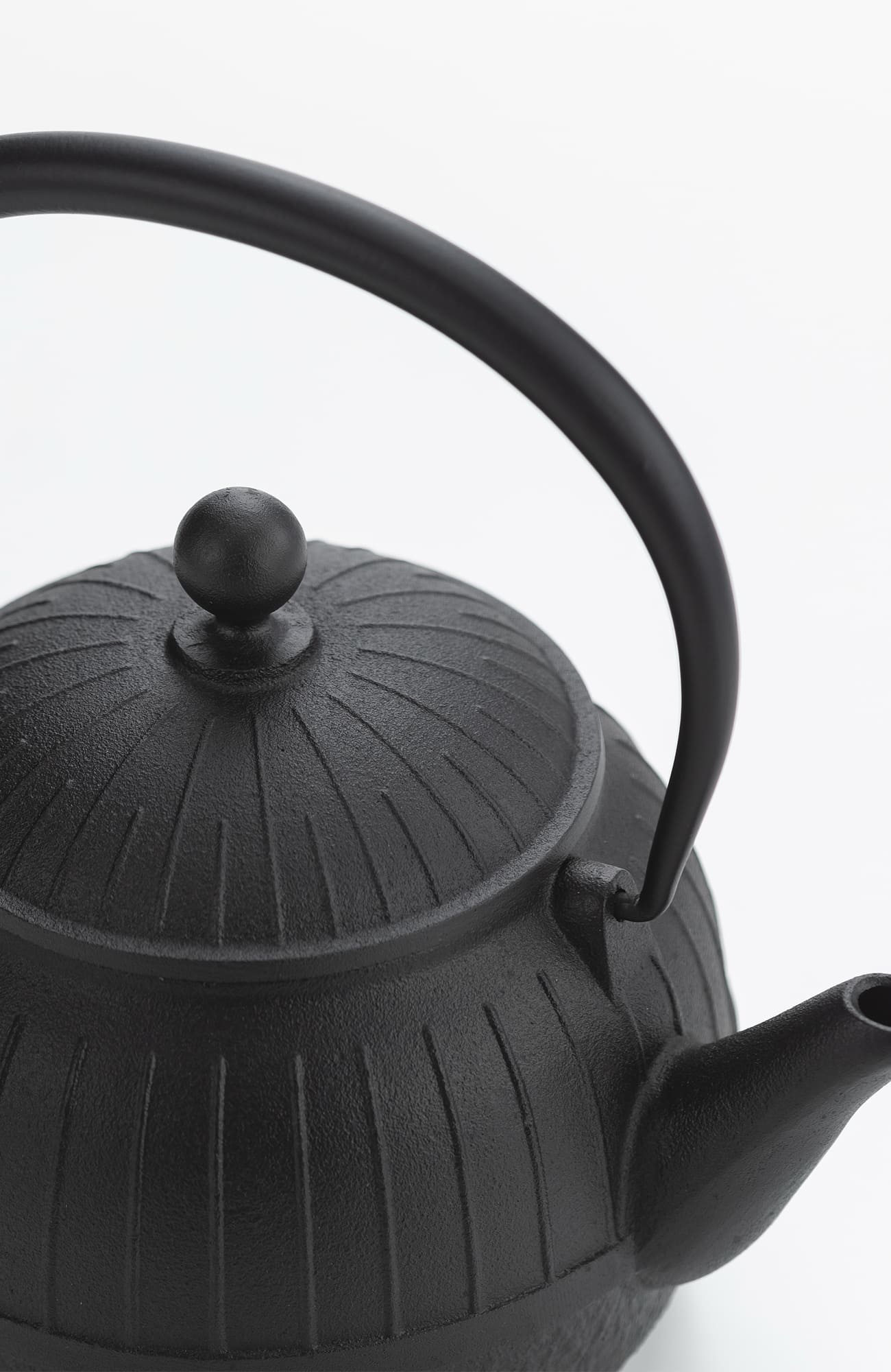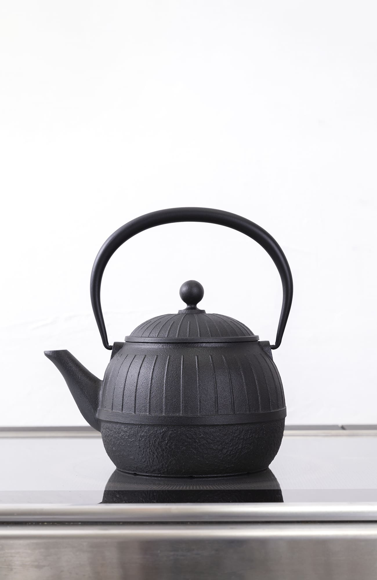 小気味よく鉄瓶全体に並ぶ縦線が印象的な鉄瓶 八千草1.2L。野に生える名も無き草たちを線で表現しています。鉄瓶というイメージからかけ離れたコンテンポラリーなカタチで鉄の湯沸かしポットといった雰囲気も持ち合わせています。モダンなキッチンにスタイリッシュな印象の鉄瓶がサマになります。湯を出し切って蓋を外すだけで他の鉄瓶に比べて大きな輪口から湯気が一気に出て内部をさっと乾かしていく。それもなんだか小気味よい。鉄瓶 平八千草 0.8Lの姉妹鉄瓶です。