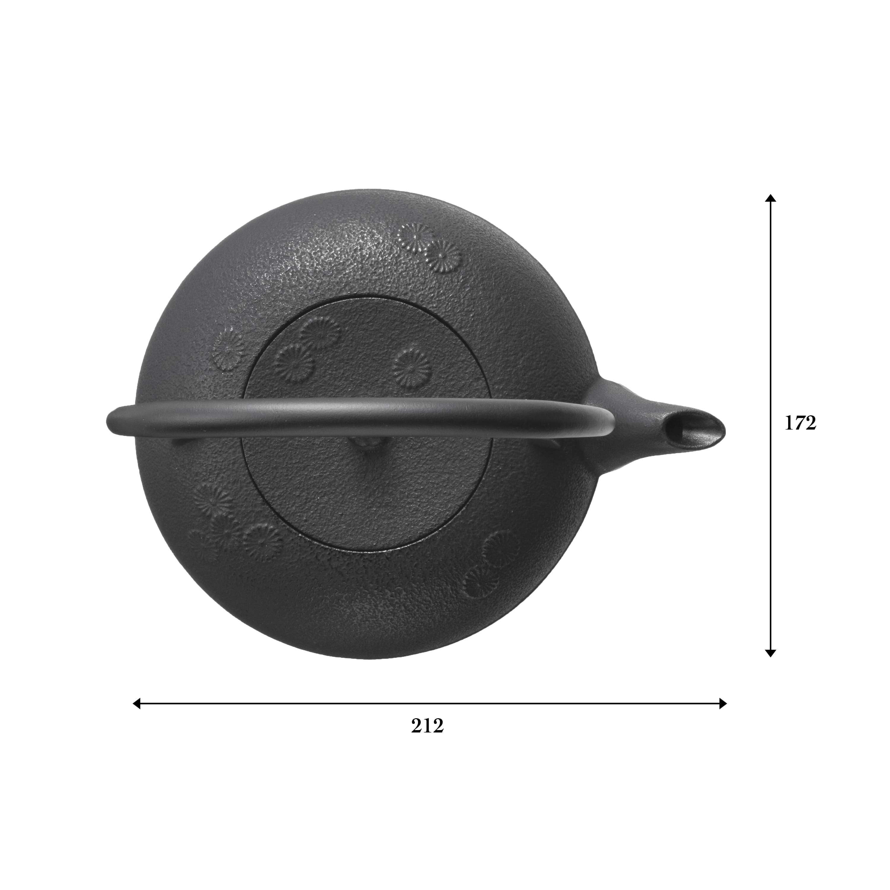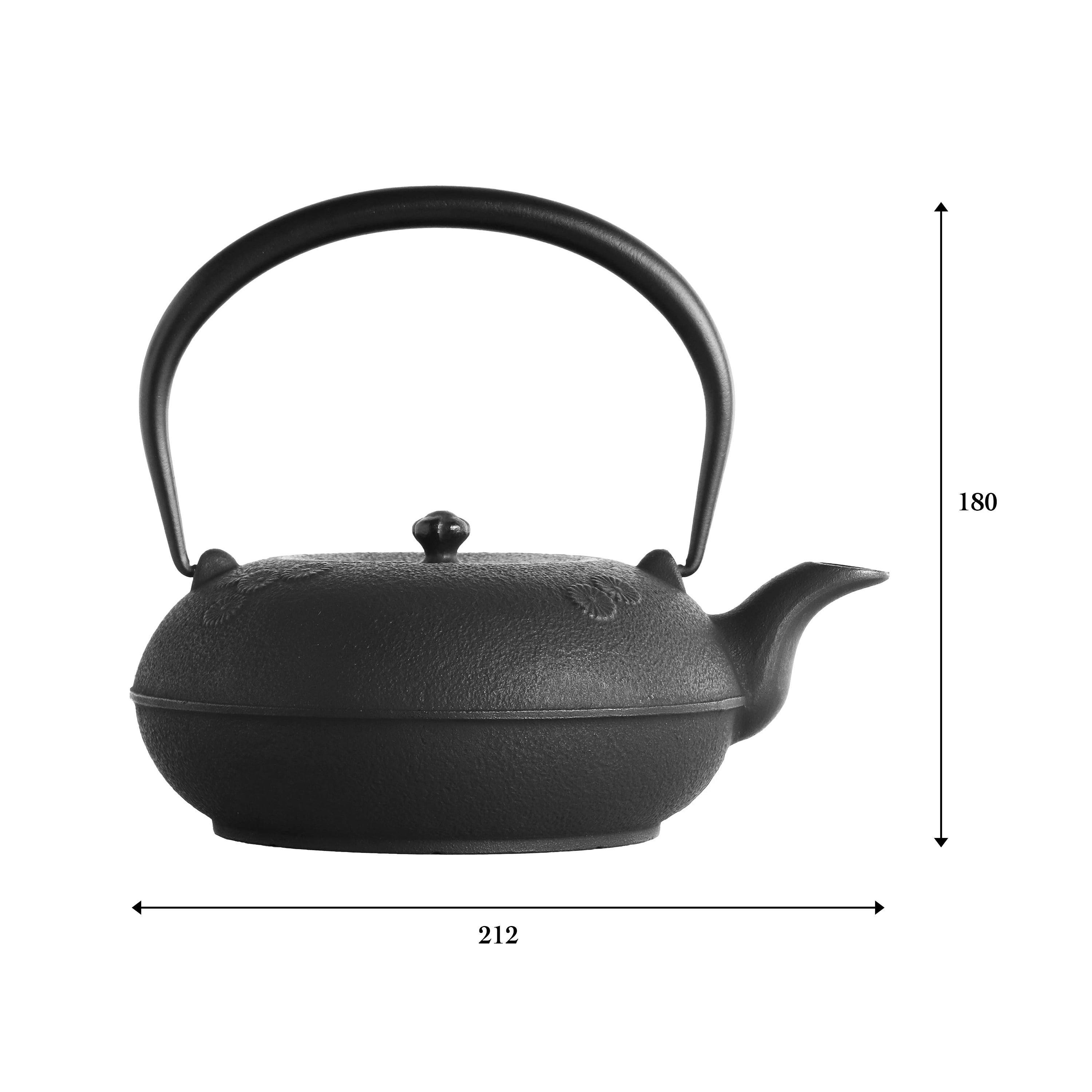「肌」と呼ばれる少しザラついた砂のような手触りの鋳肌に小菊が数個咲いている。余白と菊が1枚の画のような、中型1Lサイズの直火及びIH調理器対応の鉄瓶です。シャープな印象を与える平らな形状なので、少し傾けるだけでスムーズにお湯が出ます。IH調理器の強いパワーを受けてもビクともしない底面設計で安心してお使いいただける鉄瓶です。