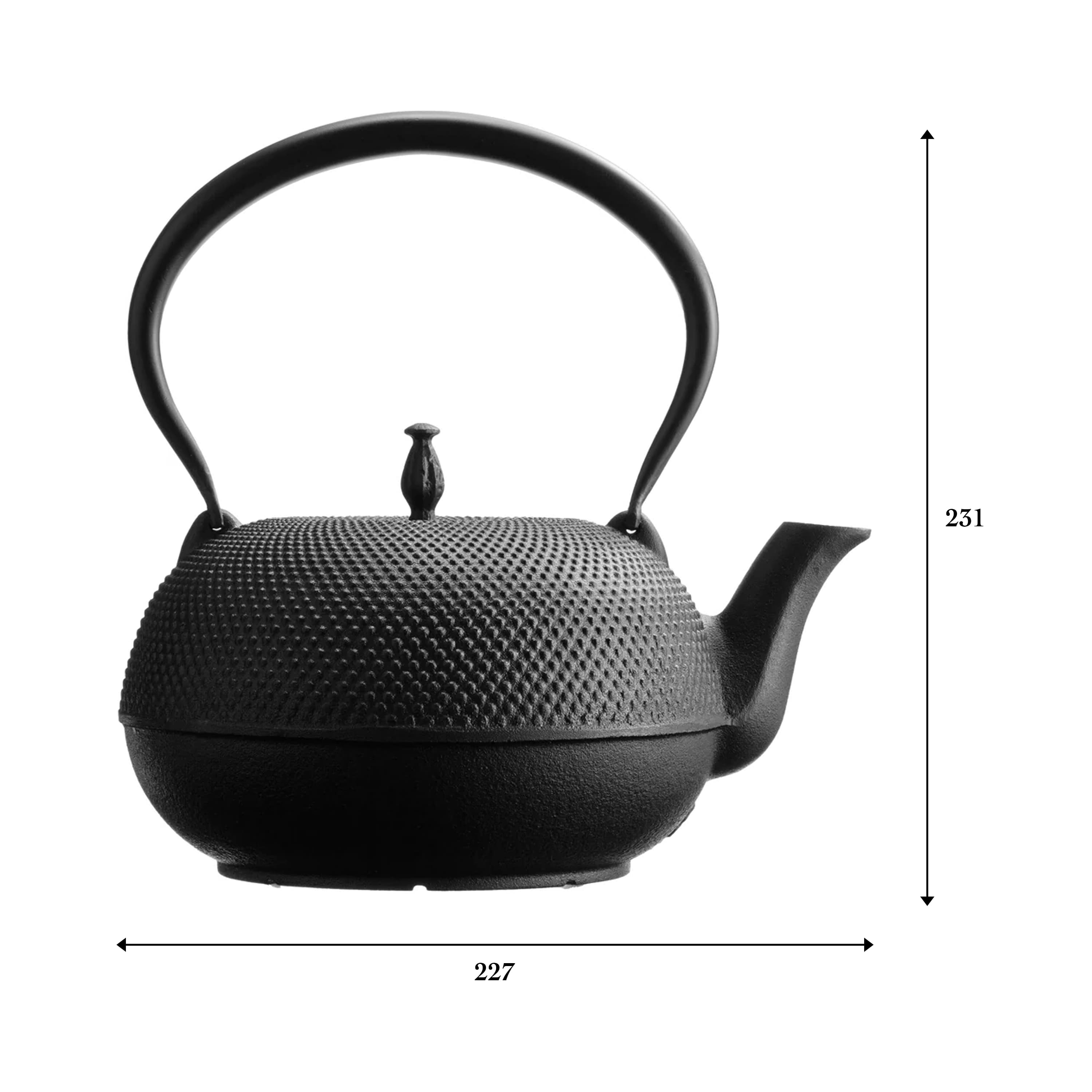 丸い月をイメージしたフォルムに、ポツポツと伝統のアラレ模様が鋳込まれている南部鉄器らしい伝統と威厳のある存在感。そんな伝統的なデザインに、どこか可愛らしい印象も垣間見える鉄瓶です。昭和の中頃まで、一般的な鉄瓶の容量の単位は一升二升と「升」が使われていました。一升は1.8Lに相当。この観月アラレは昔ながらの一升サイズで、たっぷり沸かせる大きめの鉄瓶です。