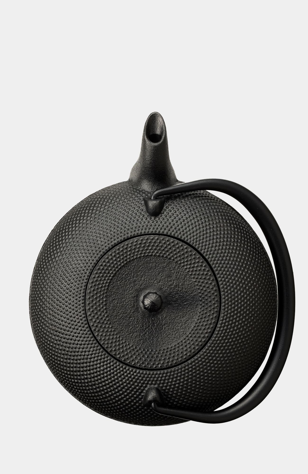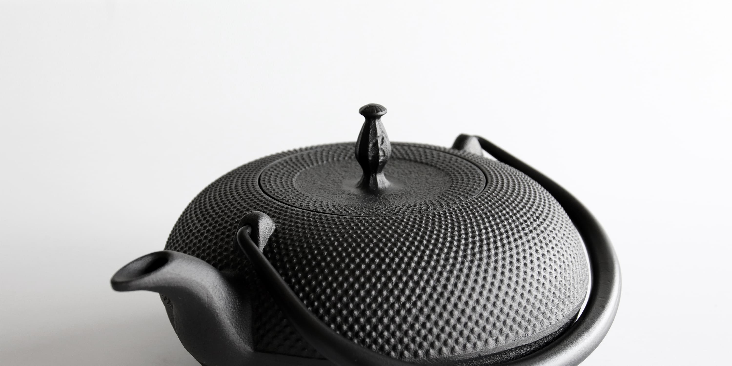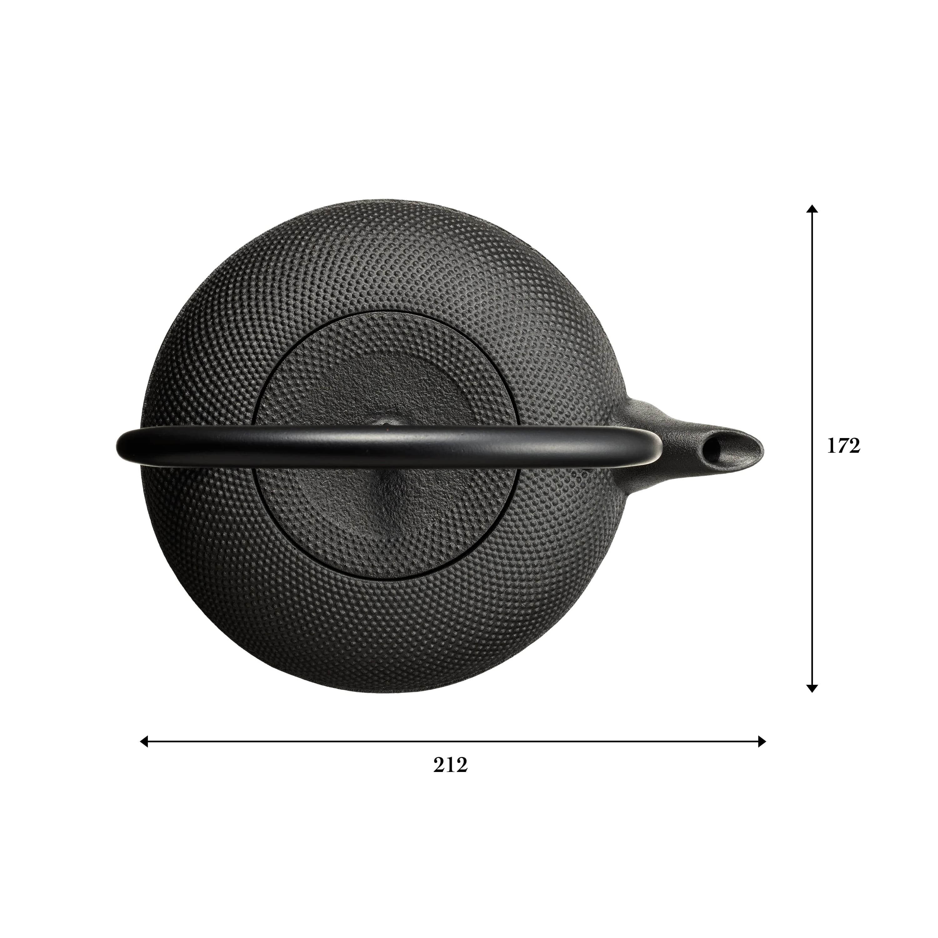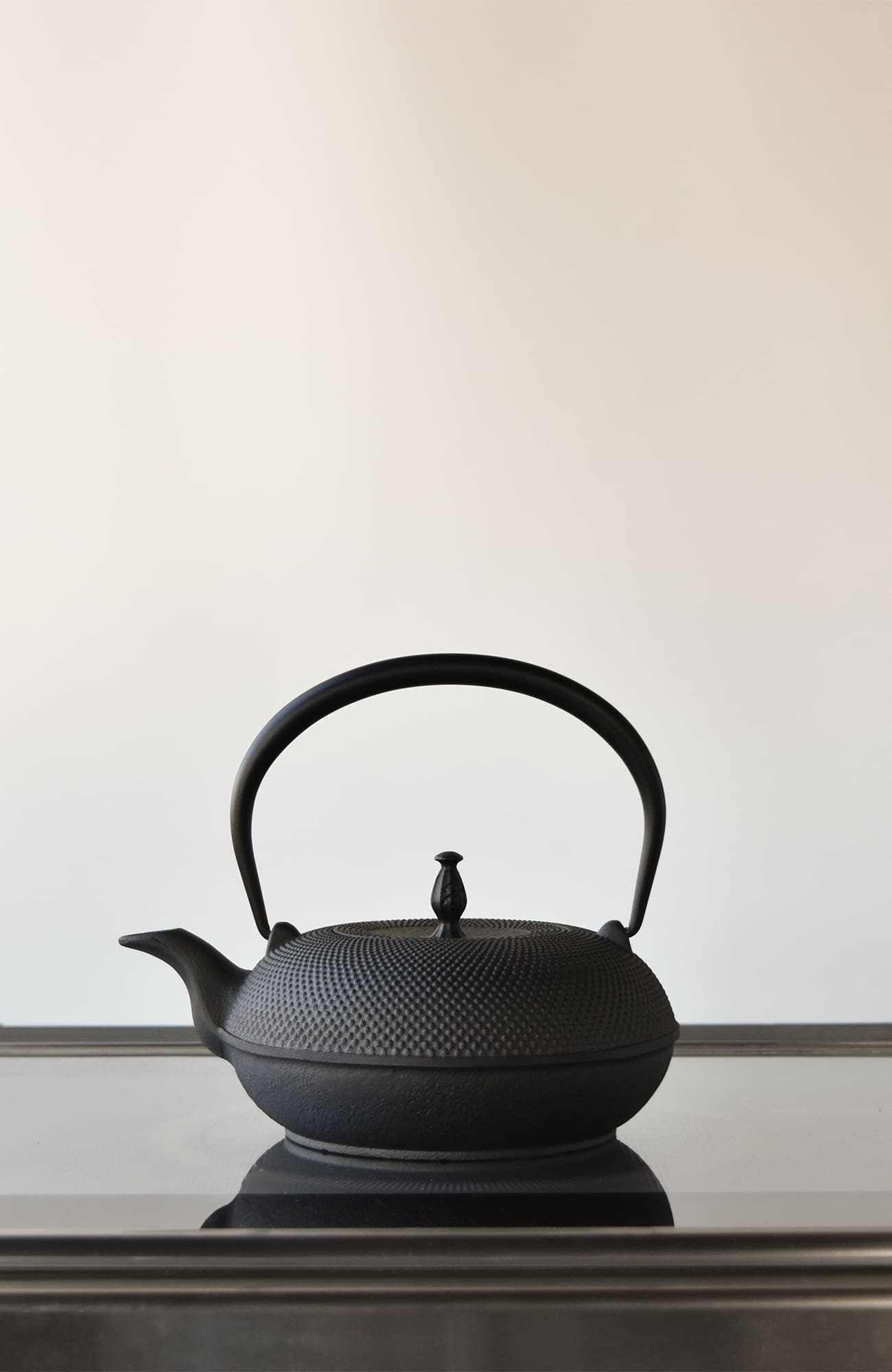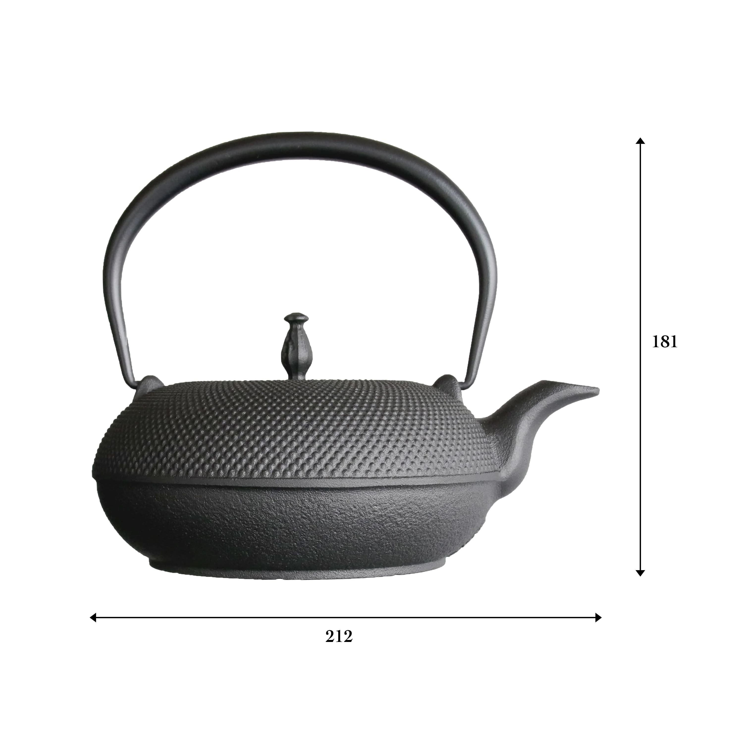 南部鉄瓶の代表的なアラレ模様をあしらった中型1Lサイズの直火及びIH調理器対応の鉄瓶です。「東雲」は少し平らな形状なので、丸い鉄瓶に比べると軽く傾けるだけでスムーズにお湯が出せます。IH調理器の強いパワーを受けてもビクともしない底面設計で安心してお使いいただける鉄瓶です。