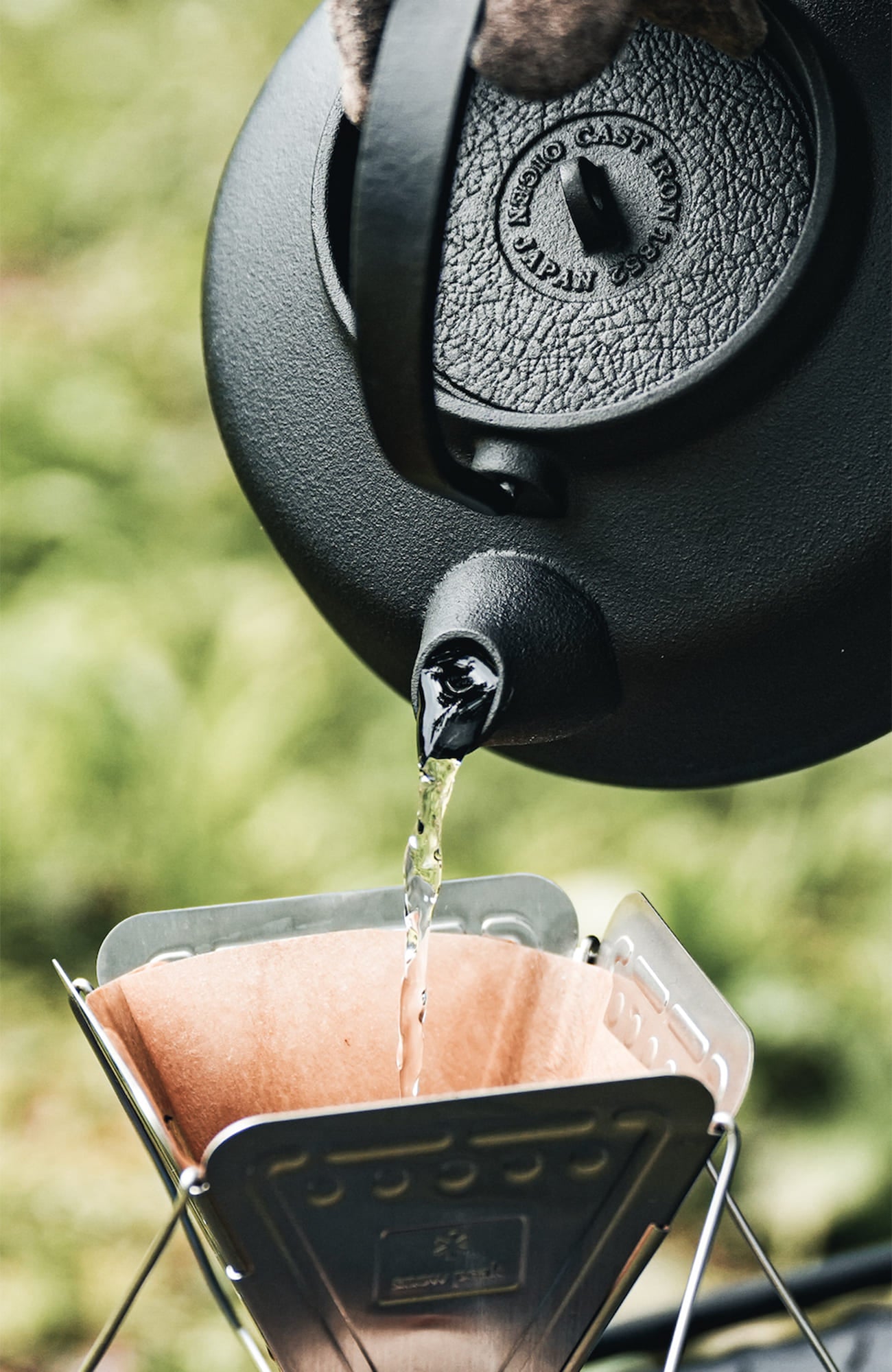 伝統の南部鉄瓶が自由な発想でアウトドアへ。ソトでの使い込みにも耐えるタフな鋳鉄ギアとしてデザインされたキャンプケトル『WAKKAS』。“ワッカス”という名前は「沸かす」から。2サイズ展開のうちWAKKAS 1300は大きいサイズです。実用容量は約1L(満水約1.3L)で、お茶や珈琲を5~6杯程度のお湯を沸かすことができます。南部鉄瓶では珍しいシームレスなフォルムや短く設計した注ぎ口は、屋内外問わず「湯沸かし」をたのしむためのデザインです。